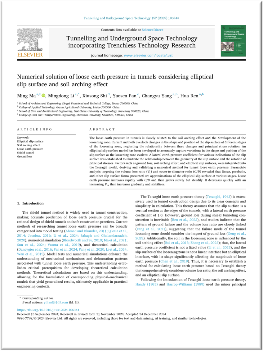 新年伊始,我院教师马明以第一作者身份在国际顶级SCI期刊《Tunnelling and Underground Space Technology》(中科院 & JCR双一区Top)上发表了题为“Numerical solution of loose earth pressure in tunnels considering elliptical slip surface and soil arching effect”(《考虑椭圆形滑移面和土拱效应的隧道松动土压力数值解》)的学术论文。这是我院首次以第一作者单位发表中科院一区Top期刊,标志着我院高水平论文发表的重大突破,对我院科研高质量发展具有积极推动作用。